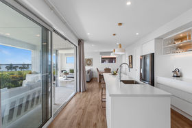 Upstairs is the true highlight of the home. The master suite offers a peaceful private retreat, complete with water views, a walk through wardrobe, and a luxurious tiled ensuite featuring both a shower and a bath for ultimate relaxation. The sleek entertainer's kitchen sits at the heart of the home, featuring a walk-in scullery, and a generous island where you can prepare meals while taking in the serene harbour outlook. Spacious open plan dining and living areas flow seamlessly to a sun-drenched, covered deck, creating effortless indoor/outdoor living - perfect for alfresco dining, entertaining guests, or simply unwinding while enjoying the activities in the park and the ever-changing 180-degree harbour views. A third guest toilet on this level adds everyday convenience.